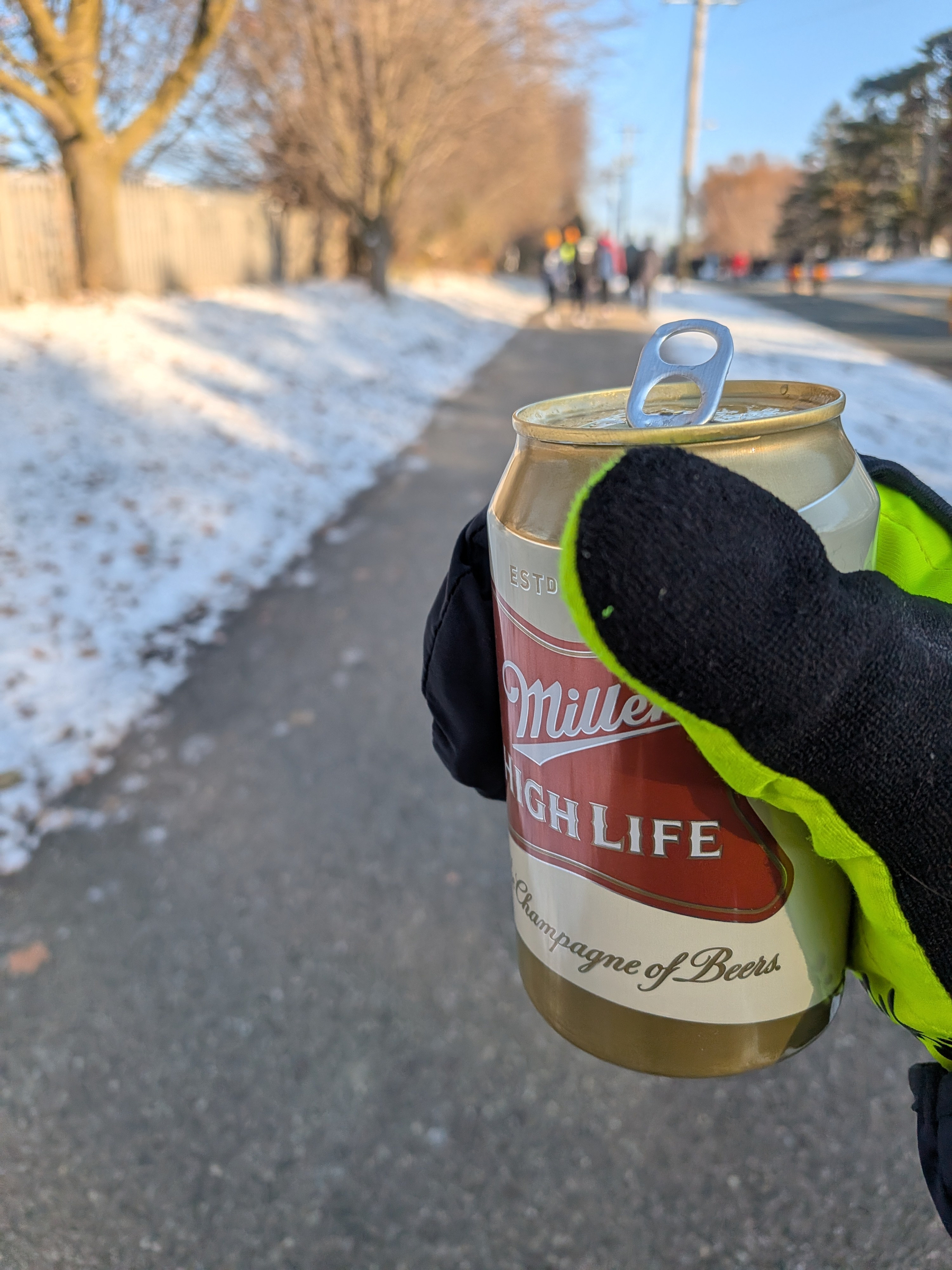 Chanhassen Turkey Trot with the kids today. At about the 1mi mark some folks were handing out cans of High Life. I partook as the kids were mostly a walking pace.