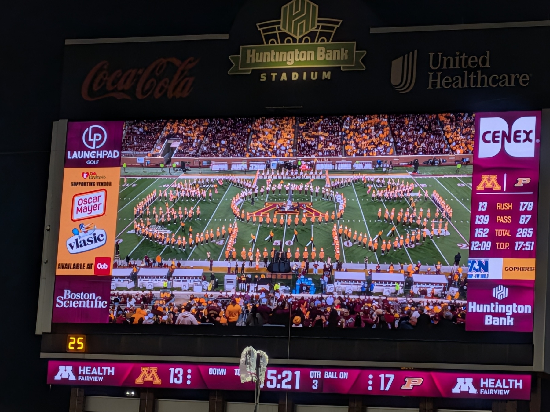 During halftime off the Gopher game last night, Chad Smith of the Red Hot Chili Peppers played drums in the middle of the Pride of Minnesota Marching Band. Cool show. Though he definitely wasn’t marching 😉 he was well mic’d and played with his typical enthusiasm.